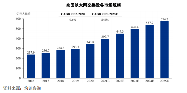 预计 2025 年市场规模将达到 574.2 亿元,2020-2025 年年均复合增长率为 10.8%,将占全球以太网交换设备市场规模的 27.2%,占比将大幅提高。
