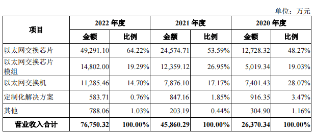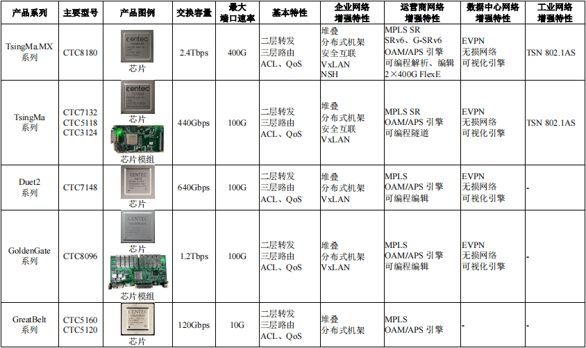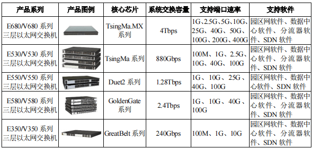 公司主要产品包括以太网交换芯片及配套产品。在聚焦以太网交换芯片业务的基础上,基于自研以太网交换芯片,公司为行业客户进行定制化开发,为其提供以太网交换芯片模组及定制化产品解决方案。此外,公司亦构建以太网交换机产品,旨在探索下一代企业网络、运营商网络、数据中心网络和工业网络等多种应用场景需求,为芯片业务推广提供应用案例。