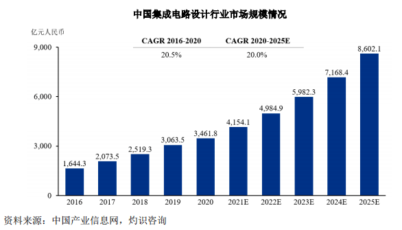 根据中国产业信息网、灼识咨询数据,中国集成电路设计产业市场规模从 2016 年的 1,644.3 亿元增长到 2020 年的 3,461.8 亿元,年均复合增长率为 20.5%。预计至 2025年市场规模将达到 8,602.1 亿元,2020-2025 年年均复合增长率为 20.0%。