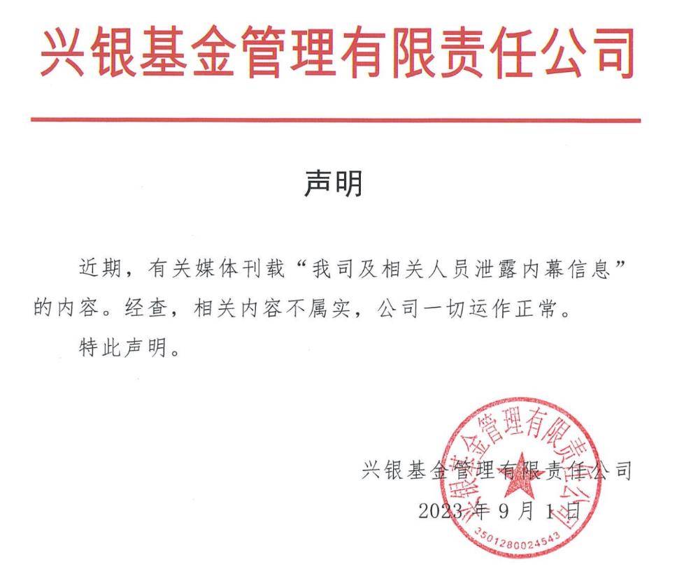 对此,兴银基金于9月2日在官网发布声明称,经查,“泄露内幕信息”相关内容不属实,公司一切运作正常。