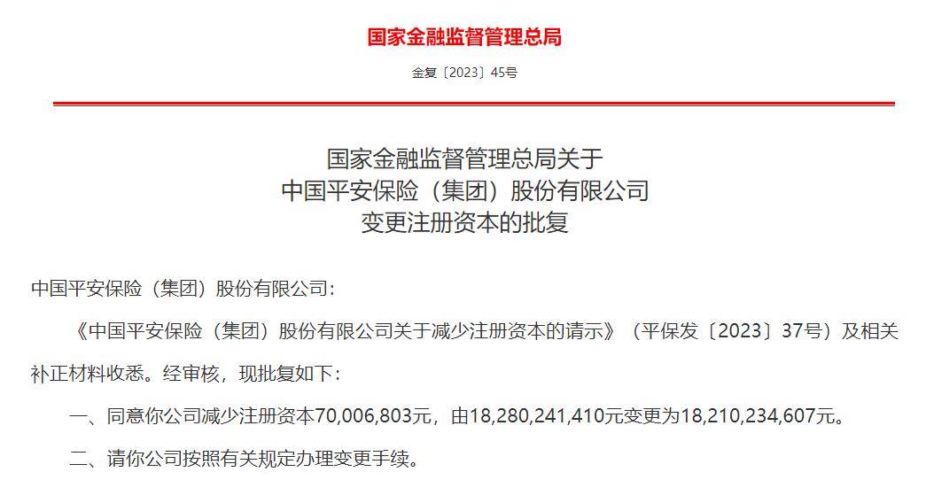 6月12日, 国家金融监督管理总局发布了《关于中国平安保险(集团)股份有限公司变更注册资本的批复》,批复显示,同意中国平安保险减少注册资本70,006,803元,由18,280,241,410元变更为18,210,234,607元。
