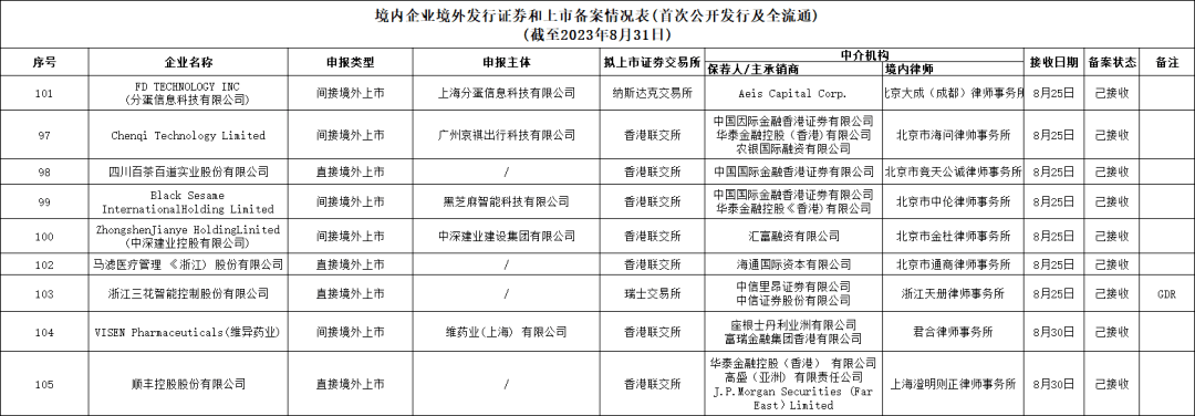 同日,证监会还更新了境内企业境外发行证券和上市备案情况(首次公开发行及全流通)(截至2023年8月31日),共105家境内企业备案(剔除了已完成的企业)。