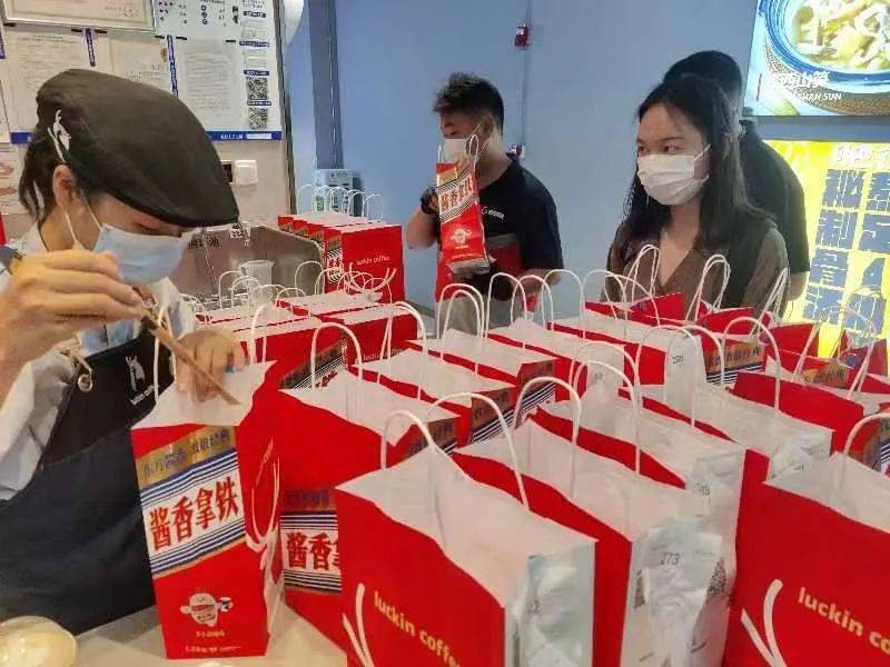 周一早八点,万通金融中心的瑞幸咖啡刚刚开门,酱香拿铁新品随之上线。半小时后,店内取单台已被具有经典茅台元素的咖啡包装袋占据。