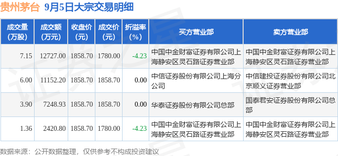 9月5日贵州茅台发生大宗交易,交易数据如下: