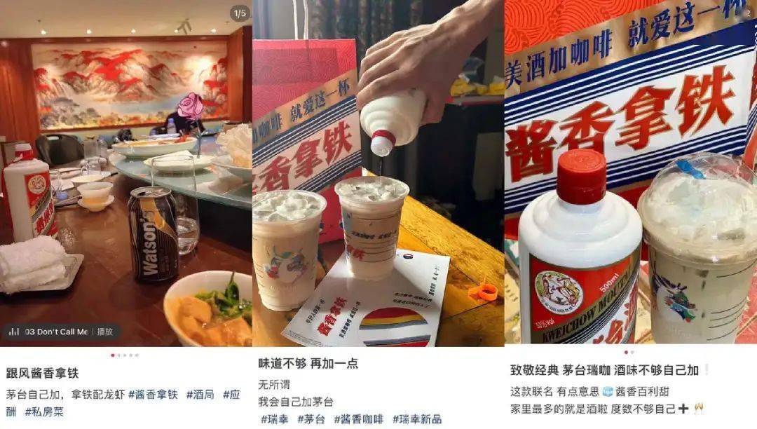 有了茅台加持,瑞幸也高端起来。抢不到茅台,可以抢酱香拿铁。有人阴阳怪气道,“咱们瑞不限购么”,也有人秀出了瑞幸配真茅台的图,“有点淡,我自己加点”。这些爱茅台的中年人,除了长期被年轻人们吐槽酒桌文化以外,终于找到了不招人讨厌的炫耀方式。