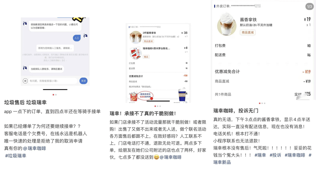 不过,短时间内的大量爆单,热度过高也对瑞幸造成了反噬。不少消费者向商业数据派吐槽,“等了3小时还没送到,到店里没法自提,联系客服退不了单。”
