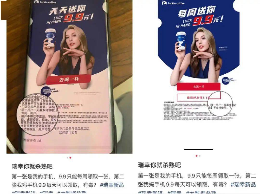 即使是9块9的活动,也已经有不少网友在社交平台上分享,存在杀熟问题,“我的活动页面显示每周领一张,但我妈显示每天一张券。”