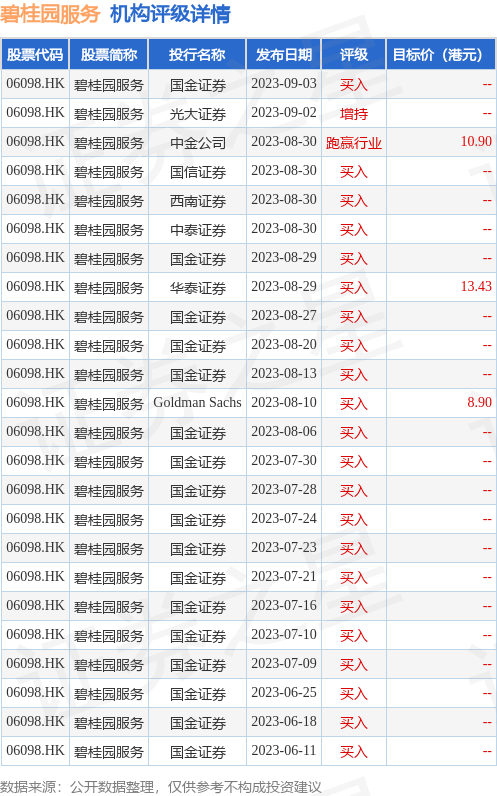 截至2023年9月5日收盘,碧桂园服务(06098.HK)报收于9.58港元,上涨2.02%,换手率1.45%,成交量4886.39万股,成交额4.61亿港元。投行对该股的评级以买入为主,近90天内共有22家投行给出买入评级,近90天的目标均价为11.08港元。国金证券最新一份研报给予碧桂园服务买入评级。