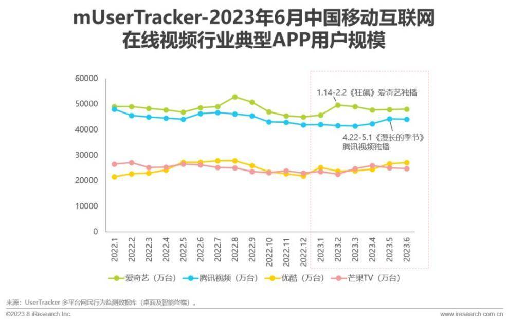 其次由用户覆盖率分析,艾瑞咨询提供的《2023年H1中国移动互联网流量半年报告》显示,2022年1月至今,腾讯视频的APP用户规模就一直被爱奇艺压在塔下。尤其是今年初《狂飙》爆红以后,全民观剧热潮带动了爱奇艺平台热度的大幅跃升,后续《平原上的摩西》、《长风渡》等优质剧集紧随其后,关注度的延续也来到了新的高度。