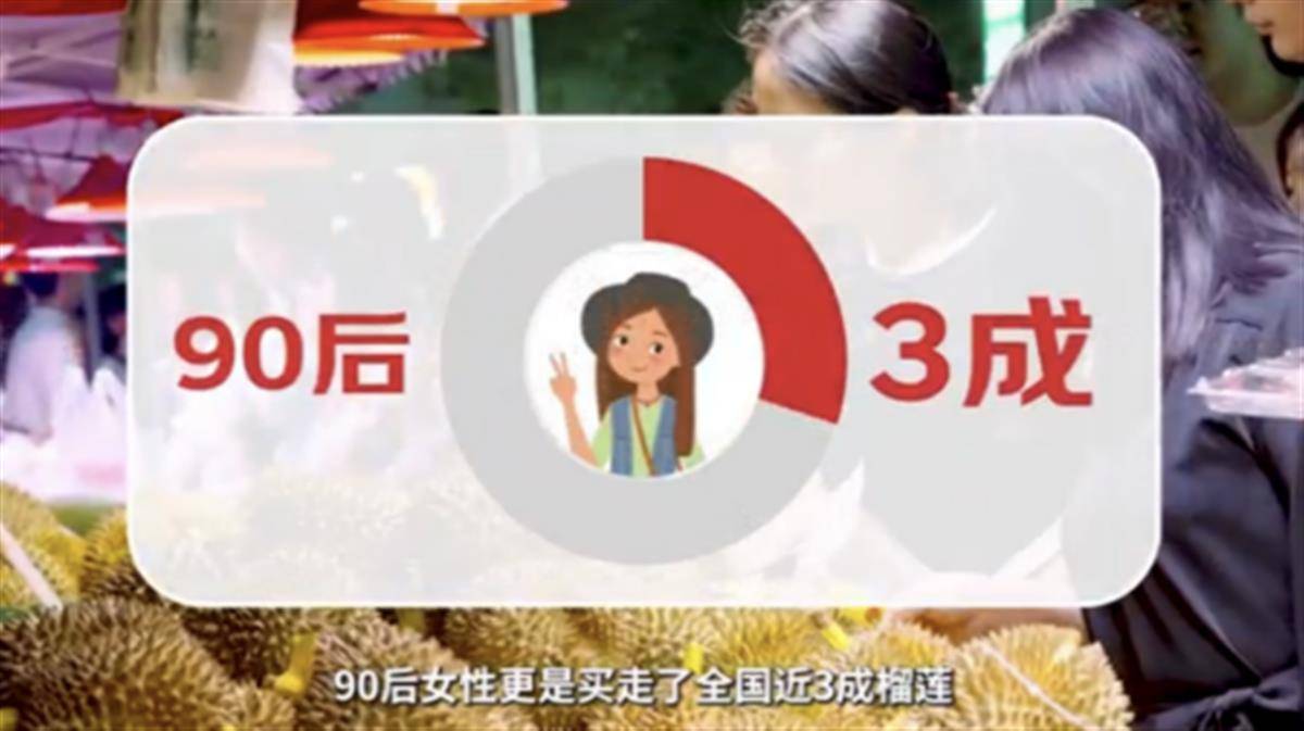 报告显示,今年1月至8月,京东线上销售的进口榴莲销量比2019年同期增长超3倍,品牌数增长超过2倍,商品数量增长3.7倍。从年龄角度看,90后成线上榴莲最大买家,买走近一半榴莲,其中90后女性占比近3成。从地域角度看,2023年以来,网购榴莲消费增长最高的是县域农村,今年1月至8月县域农村网购的榴莲销量比2019年同期增长7.7倍。小镇青年超越城市白领,买走了全国四分之一的榴莲,成新消费主力。
