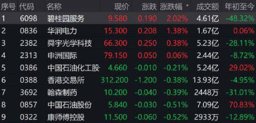 碧桂园服务涨2.02%,华润电力涨1.38%,舜宇光学科技涨0.38%,领涨蓝筹。融创中国获纳入港股通名单,大涨逾25%。