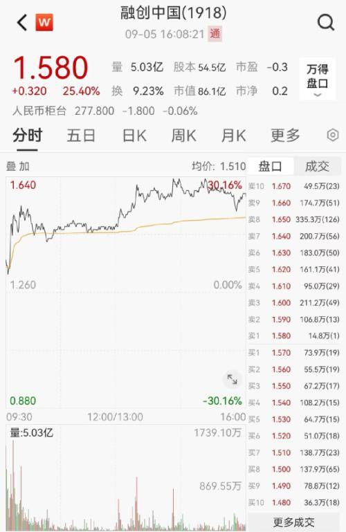 受回归港股通标的股票名单,及新楼盘热卖双重利好拉动,融创中国股价狂飙。9月5日,公司股价开盘一路飙升,最高涨幅达30.16%,最终收报1.58港元,涨25.4%。近5日累计涨61.22%。