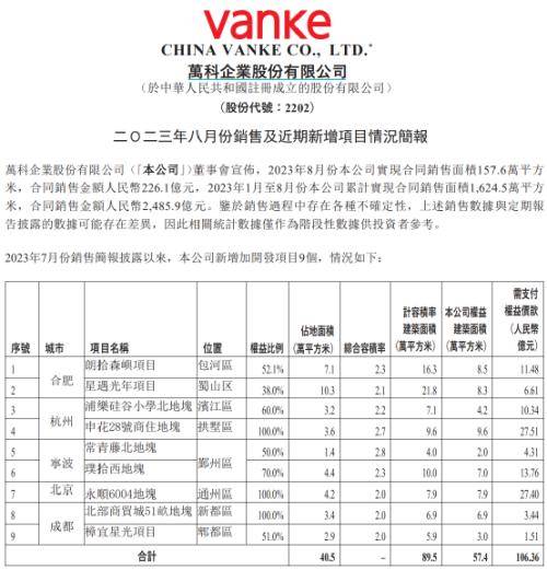 9月5日收盘后,万科企业在港交所发布公告称,8月份公司实现合同销售面积157.6万平方米,合同销售金额226.1亿元。2023年1月至8月份公司累计实现合同销售面积1,624.5万平方米,合同销售金额人民币2,485.9亿元。
