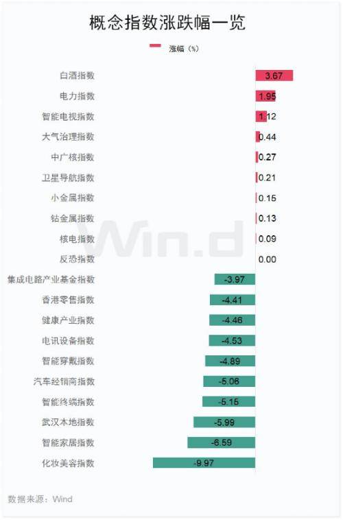 从盘面来看,Wind概念板块多数下跌,化妆美容指数跌9.97%,智能家居指数跌6.59%,武汉本地指数跌5.99%。涨幅方面,白酒指数涨3.67%,电力指数涨1.95%,智能电视指数涨1.12%。
