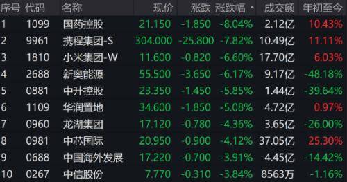 国药控股跌8.04%,携程集团跌7.82%,小米集团跌6.60%,领跌蓝筹。热门题材半导体、AI回落,商汤跌近5%,中芯国际跌超4%。