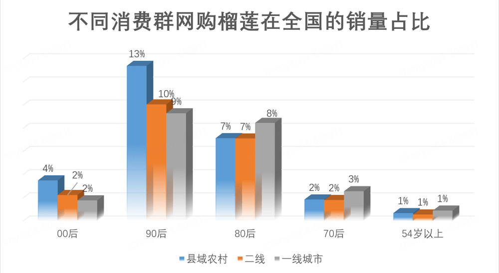 其中,小镇青年是绝对主力。县域农村的青年消费者(包括00后、90后、80后)网购了全国24%的榴莲,相当于买走了全国近四分之一的榴莲,销量占比明显超过一二线城市的年轻人群。
