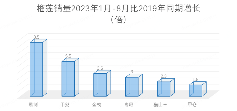 * 黑刺、干尧榴莲销量比2019年同期增长超5.5倍,金枕、青尼榴莲销量增长超3倍;