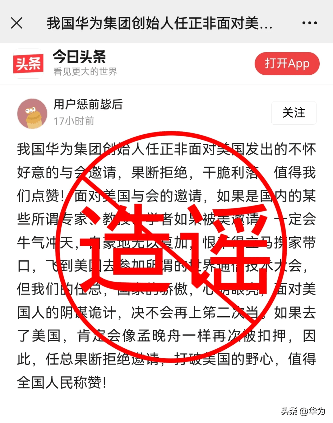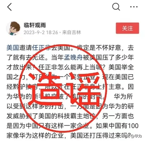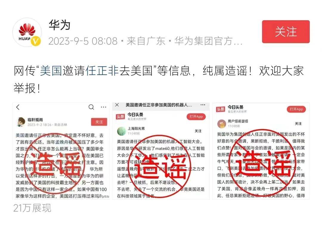 9月5日,华为官方账号发文称:网传“美国邀请任正非去美国”等信息,纯属造谣!欢迎大家举报!