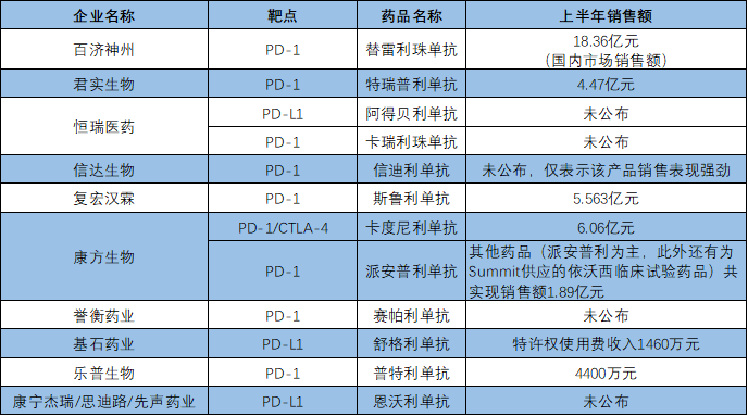 上半年PD-(L)1产品销售情况 来源:澎湃新闻记者根据半年报梳理