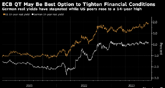 随着有越来越多的证据显示,紧缩货币政策对经济构成损害,交易员押注,欧洲央行几乎已经完成了加息行动。但在较长期实际利率今年未能走高的情况下,荷兰国际集团、瑞穗国际和AFS Group的分析师认为,央行可能会寻求以更快步伐收缩债券持仓。