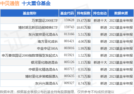 根据2023基金半年报公募基金重仓股数据,重仓该股的公募基金共16家,其中持有数量最多的公募基金为万家国证2000ETF。万家国证2000ETF目前规模为7.8亿元,最新净值0.9716(9月1日),较上一交易日下跌0.08%,近一年下跌1.4%。该公募基金现任基金经理为杨坤。杨坤在任的基金产品包括:万家中证红利指数(LOF)A,管理时间为2019年10月24日至今,期间收益率为49.98%;万家上证50ETF,管理时间为2019年10月24日至今,期间收益率为3.87%;万家180指数,管理时间为2019年10月24日至今,期间收益率为0.55%;