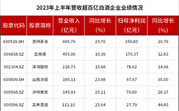 上半年,“百亿俱乐部”——贵州茅台、五粮液、洋河股份、山西汾酒、泸州老窖、古井贡酒均实现营业收入、归母净利润两位数增长,展现出较强的发展韧性;六家企业合计总营收为1818.69亿元,增幅为20.26%,六家企业总营收占全部白酒上市公司总营收的84.24%,行业集中度进一步提高,“马太效应”愈加明显。