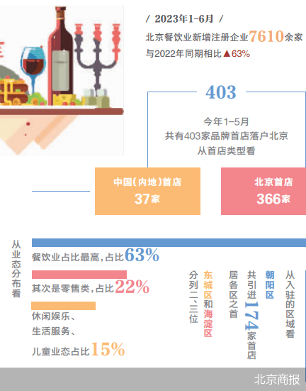 同时,云程在大会上发布了《2023北京餐饮业观察报告》(以下简称《报告》)。《报告》对北京餐饮行业的特点进行深度剖析,呈现出行业的新趋势和新变局。《报告》显示,北京市2023年1-6月餐饮业新增注册企业同比上涨63%。首店方面,今年1-5月,共有403家品牌首店落户北京,从业态分布看,餐饮业占比最高,占比为63%。