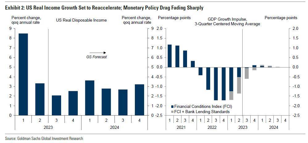 二是,高盛仍很不认同这种观点,即:货币紧缩长期且多变的滞后对经济的拖累越来越大,从而酿成经济衰退,高盛认为,货币紧缩的拖累将继续减弱,到明年初完全消失。