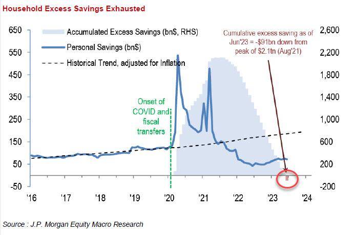 华尔街见闻8月文章曾提到,最近两年,美国消费者的强劲支出部分来自新冠疫情爆发后的过剩储蓄。而摩根大通8月的研究警告,超额储蓄带来的巨大经济推动力现在已经消耗殆尽。摩根大通的下图可见,累积超额储蓄在2021年8月达到高峰期时有2.1万亿美元,到今年6月为-910亿美元。