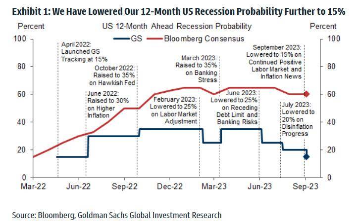 高盛首席经济学家Jan Hatzius领衔的经济学家团队最近再次下调美国经济衰退的预期概率,从之前的20%降至15%,远低于彭博的共识预期概率60%。
