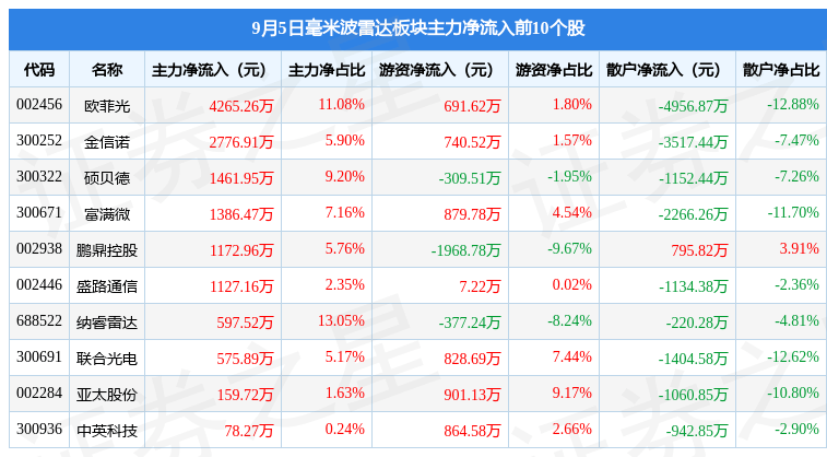 9月5日毫米波雷达板块较上一交易日下跌0.42%,阿莱德领跌。当日上证指数报收于3154.37,下跌0.71%。深证成指报收于10540.71,下跌0.67%。毫米波雷达板块个股涨跌见下表: