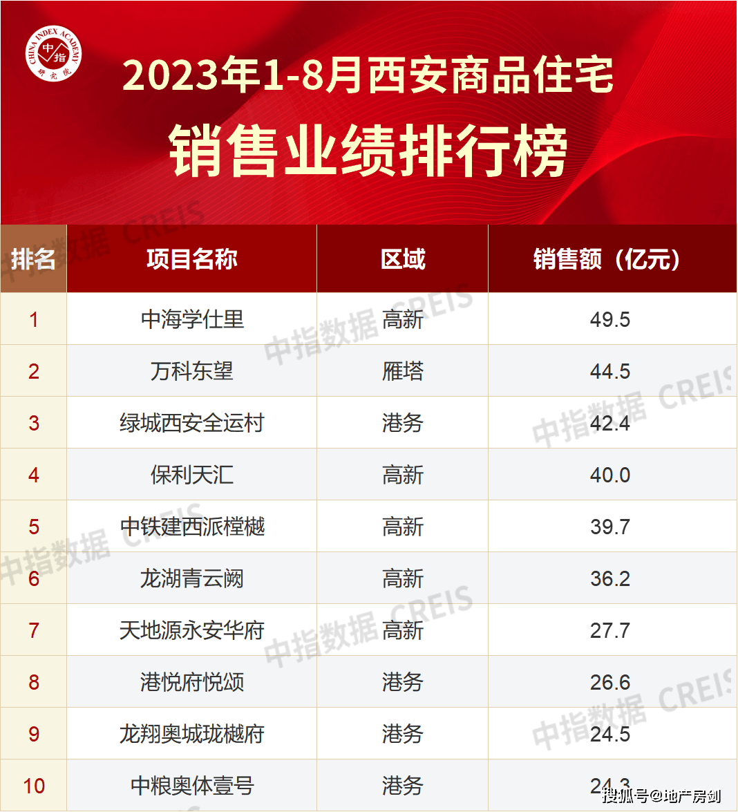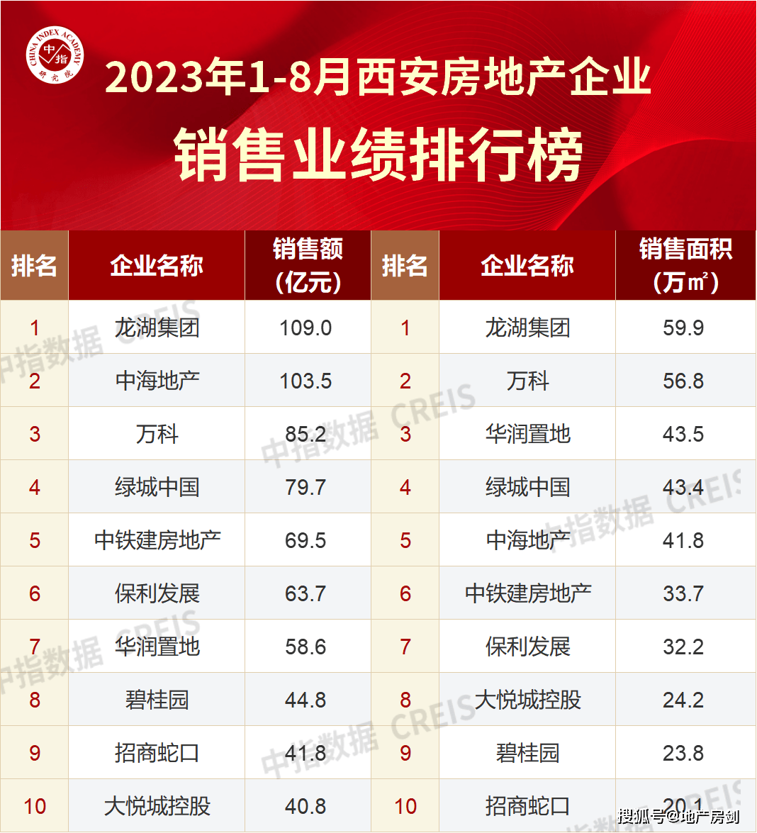 中指研究院《2023年1-8月西安房地产企业销售业绩TOP10》显示,龙湖、中海分别以109亿元、103.5亿元继续稳居西安房企销售额排行榜前2位,正式迈入百亿。
