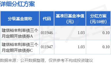 9月6日发布《建信裕丰利率债三个月定期开放债券型证券投资基金分红公告》。本次分红为本基金2023年度的第二次分红。公告显示,本次分红的收益分配基准日为8月8日,详细分红方案如下: