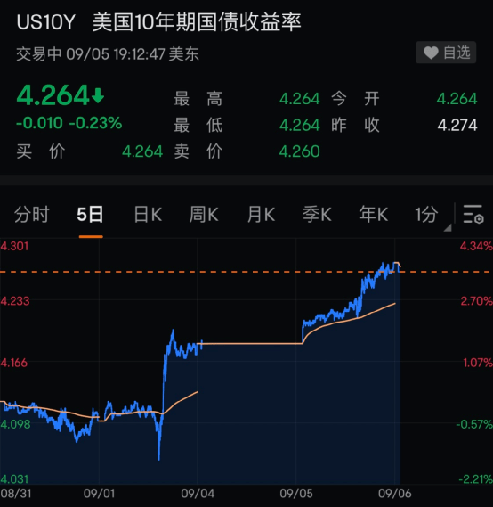 周一美国劳工节过后,美国国债收益率攀升,周二美国10年期国债收益率攀升至4.21%,上周五在4.09%左右。