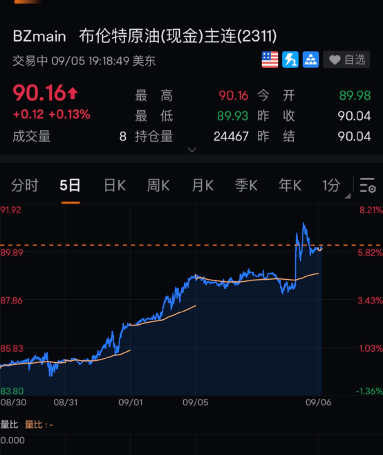 受此影响,美国WTI原油期货周二收高,10月交割的WTI期货价格上涨1.14美元,涨幅为1.33%,收于每桶86.69美元,目前价格位于86.86美元/桶。