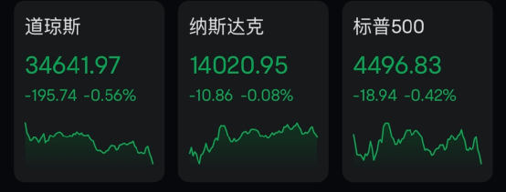 截至收盘,道指跌195.74点,跌幅为0.56%,报34641.97点;纳指跌10.86点,跌幅为0.08%,报14020.95点;标普500指数跌18.94点,跌幅为0.42%,报4496.83点。