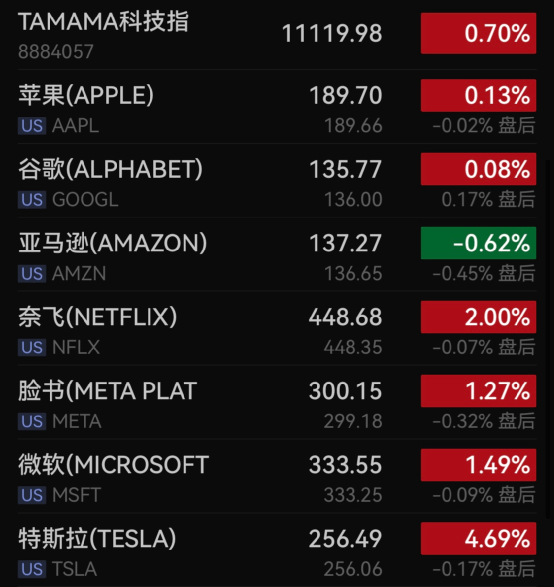 科技股多数上涨,苹果涨0.13%,亚马逊跌0.62%,奈飞涨2%,谷歌涨0.08%,脸书涨1.27%,微软涨1.49%。