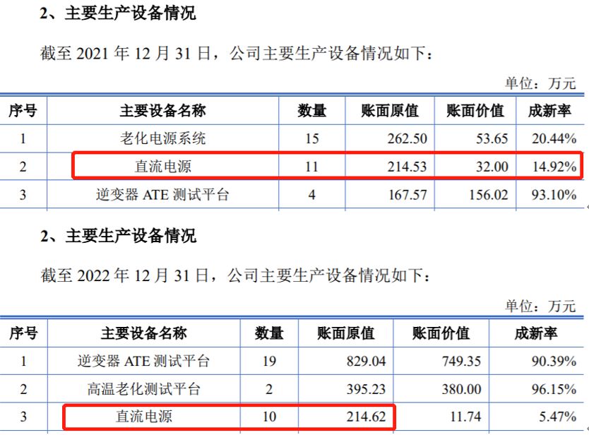 还有三晶电子在2022年7月和2023年8月均发布过招股书,其中也都包含有主要生产设备情况,“直流电源”是公司的主要生产设备之一,招股书披露2021年末拥有11台、账面原值合计214.53万元,2022年末则拥有10台、账面原值为214.62万元,上述数据前后矛盾。