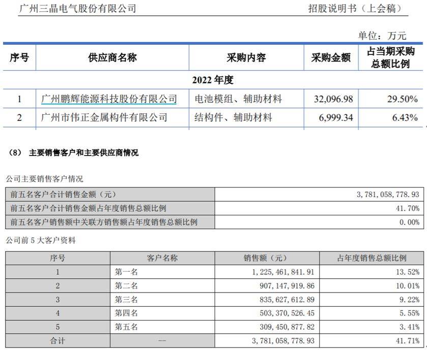 再来看三晶电气的经营信息,“广州鹏辉能源科技股份有限公司”是公司重要供应商,招股书披露在2022年公司向该供应商采购金额高达3.21亿元,但与此同时根据鹏辉能源发布的2022年年报显示,当年第四和第五大客户对应的销售金额分别为5.03亿元和3.09亿元,均与三晶电气公布的采购金额相差不少。