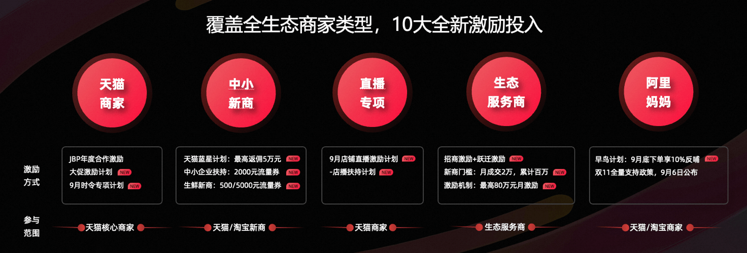 据大会透露,淘宝天猫将在JBP年度合作激励的基础上,发布大促激励计划,双11期间,天猫核心商家完成超出目标销售GMV后,扣点优惠可低至5折 ,双11期间达成挑战目标,整体佣金可享6折。在月饼、大闸蟹、茶叶、水产等节令品类上,也将提供返佣的专项扶持。