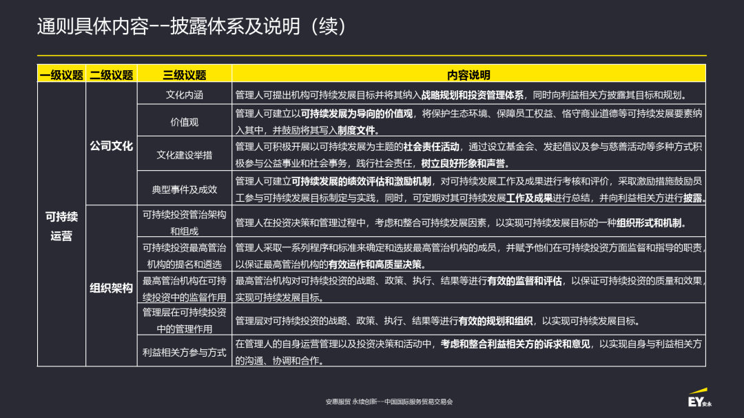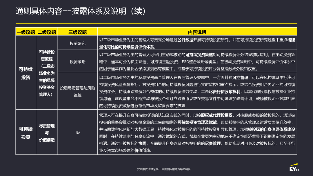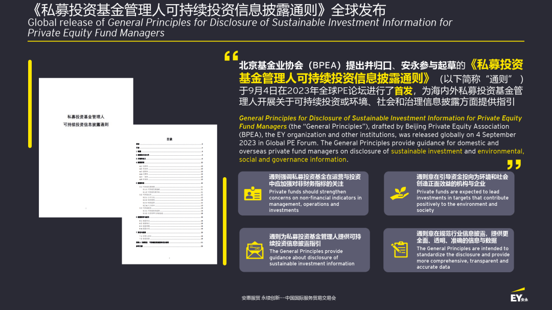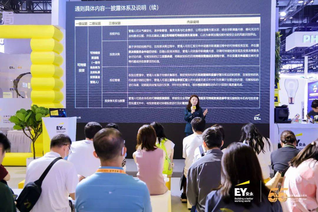 9月5日,由北京基金业协会(BPEA)提出并归口,安永(中国)企业咨询有限公司(“安永”)参与支持的国内首例《私募投资基金管理人可持续投资信息披露通则》(以下简称“通则”),在2023年中国国际服务贸易交易会(以下简称“服贸会”)安永展台进行了全球发布,该通则也已于9月4日在2023年全球PE论坛进行了首发。服贸会现场,安永大中华区战略与交易咨询总监琚晶鑫女士对披露通则的核心内容及发布意义进行了分享,并就安永长期致力于推动全社会可持续发展方面的举措及成效与现场观众进行了沟通交流。