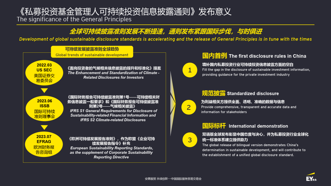 近年来全球可持续披露准则发展不断提速,本通则在当前时点发布具有深远意义,作为国内首例针对私募投资行业可持续投资信息披露方面的指引,通则紧跟国际步伐,在学习借鉴国际最新实践的基础上,也深度结合了我国经济发展及资本市场环境的现状与特点,以能规范行业披露准则,为利益相关方提供全面、透明、准确的数据与信息。安永支持BPEA在全球范围内发布双语版通则彰显了我国在可持续发展领域的态度与决心,也为私募投资行业全球化统一标准体系建立提供助力。