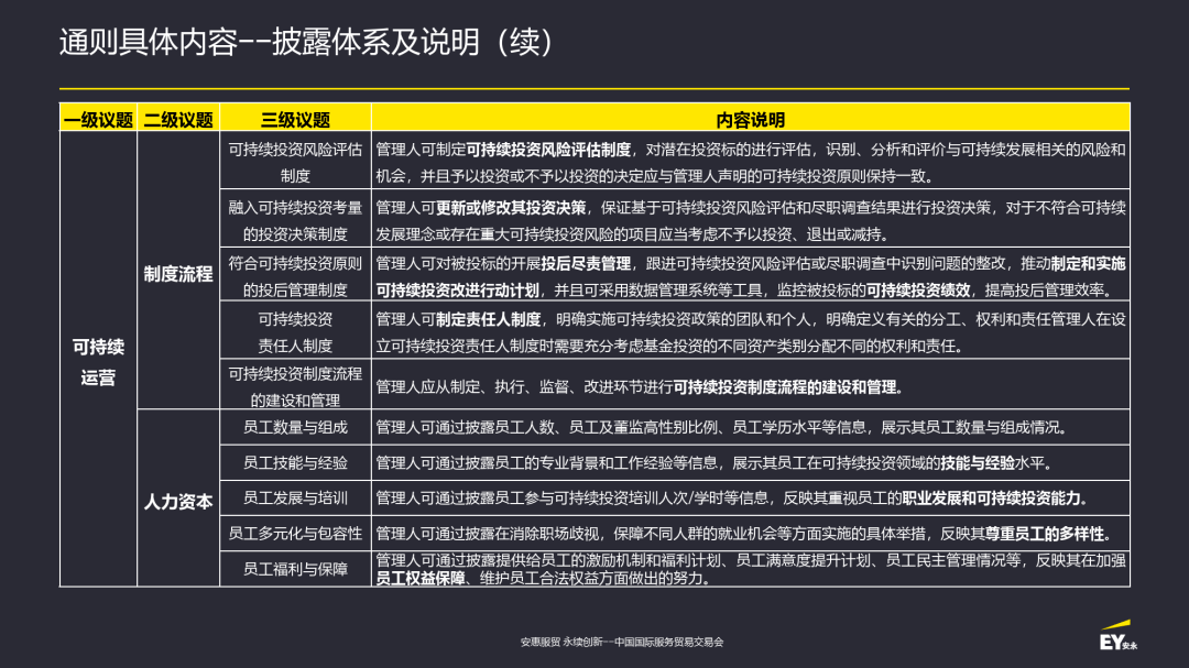 通则核心的披露体系部分从可持续发展纲要、可持续运营和可持续投资三个方向分别列举了细分披露指标和相关说明。其中,可持续发展纲要重点关注机构的可持续发展战略和目标,如对管理层承诺、机构核心价值观与发展理念、可持续发展愿景与使命的阐述;机构的可持续发展短、中、长期目标以及对目标完成情况和后续工作内容的披露等。可持续运营是对私募投资基金管理人可持续发展战略和目标的践行,通则建议管理人从公司文化、组织架构、可持续投资制度流程以及人力资本层面进行相关内容与数据的披露,包括不限于主要举措、典型事件、成效及数据。