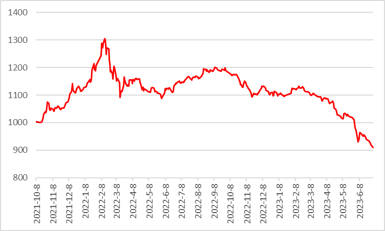 根据法询金融固收组数据,截至2023年7月3日,中证REITs全收益指数跌至跌至909点,为公募REITs上市以来的最差表现。距离2022年2月中证REITs全收益指数最高的1305点,本轮中证REITs全收益指数已下跌30.35%。且截至7月3日,2023年几乎没有REITs得到正收益。在2023年4月27日,27只REITs市值跌到906亿(发行规模是909亿),REITs整体市值规模跌破发行规模。