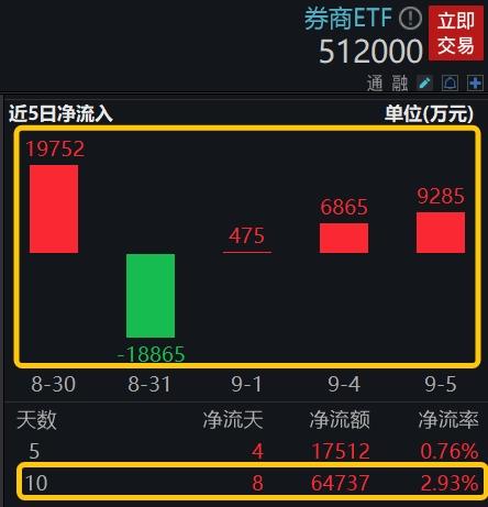 近期券商ETF(512000)资金面也显示,资金越跌越买态势显著,彰显对板块后市的乐观预期。上交所数据显示,券商ETF(512000)最新单日获资金净流入9285万元,为连续第3日增仓;拉长时间看,最近10日资金净流入8日,累计达6.47亿元。