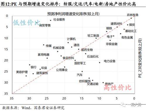 预期变动与估值定价:纺服/交运/汽车/电新具备性价比。从各行业预期净利润增速变动与PE估值变动来看,多数行业过去一个月预期净利润增速上调,但估值仍有回落,其中纺服/交运/汽车偏离度最明显。从预期变化与PE估值变化排序分布来看,纺服/交运/汽车/电新/房地产性价比较高,社服/零售性价比偏低。