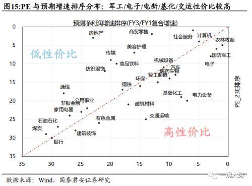 1)PE-G视角:当前性价比较高的一级行业包括:军工/电子/电新/基化/交运。性价比较低的一级行业包括:房地产/传媒/零售/美容护理。