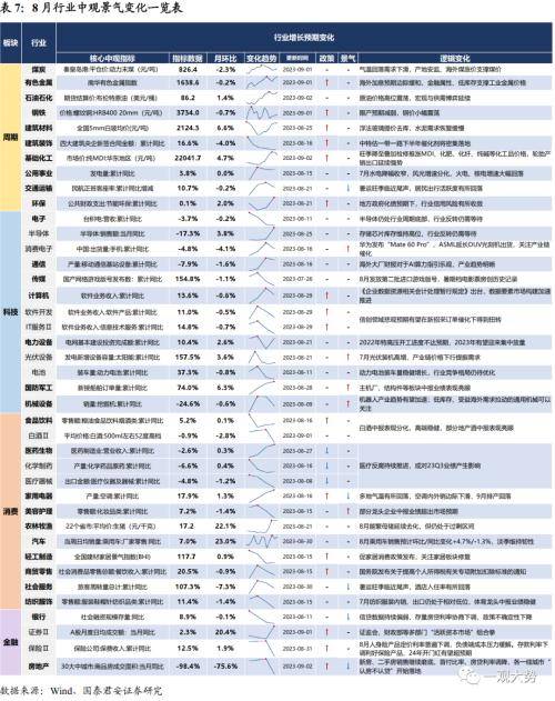 景气仍处磨底阶段,9月重点关注地产政策效果与科技产业催化。8月中观景气依旧偏弱,地产销售仍磨底,建材等地产链资源品需求持续偏弱。受传统旺季结束、暑运临近尾声影响,前期高景气的耐用品消费(汽车、空调),居民出行活跃度均有所回落;新兴产业方面,AI产业趋势延续,但整体边际变化收窄。中报季后消费与稳定板块盈利预期存在积极变化,基于业绩的预期变动短期钝化,政策与产业维度的边际更为重要。9月建议关注三条线索:1)政策效果验证期,密切跟踪地产销售高频数据的修复,这将成为决定顺周期相关(建材/家居/化工/消费)板块上涨弹性与持续性的核心线索;2)科技成长寻找边际变化大、产业催化密集的细分方向,关注机器人/制造业出海与自主可控/数据要素;3)基于中报外推,关注具备独立景气的军工/化妆品/地产酒/船舶/商用车等。