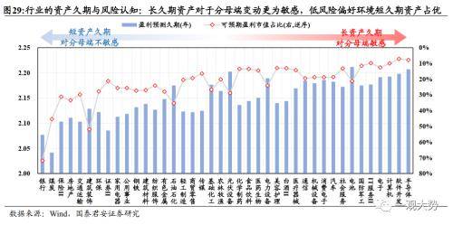 风险偏好保持低位,当期短久期的行业相对占优。我们以盈利预测久期与可预期盈利的市值占比两种方式刻画不同行业资产久期的特征。与债券类似,长久期,即远期盈利占比更高的行业赛道对于分母端(无风险利率与风险认知)的变动更敏感,而短久期,即远期盈利占比低的对于分母端的变动也相对更不敏感。当前总量增长预期分歧仍然较大,市场风险偏好水平仍然保持在较低的水平,因此短久期的资产相对比较符合当前定价环境,如银行/煤炭/保险/地产/交运/建筑等赛道。