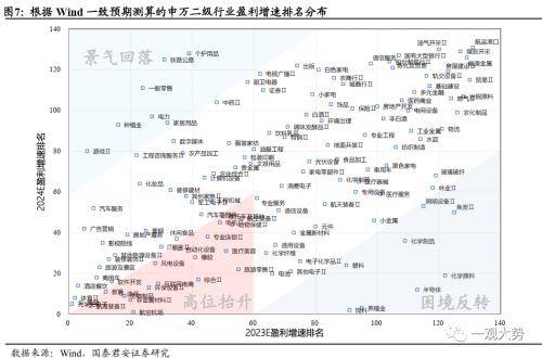 1)盈利预期增速:科技软件/公用交运/房地产/出行链2023年盈利预期增速居前,食品饮料/电力设备/家电/上游周期品等ROE水平居前。综合23E、24E盈利预期增速表现来看:景气高位抬升的二级行业包括:航海装备/造纸/生物制品/非金属材料/航空机场/环保设备/风电设备/自动化设备等。困境反转的二级行业包括:半导体/化学原料/养殖业/化学制品/塑料。增速高位回落的二级行业包括:家居用品/一般零售/游戏/铁路公路/电力。